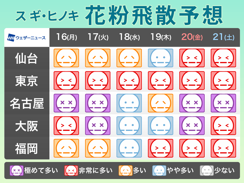 この暖かさと晴天によって、東北から九州にかけてスギ花粉が本格的に飛散するとみられます。西日本や東日本ではヒノキ花粉も飛び始める可能性があるため、症状の出やすい方は万全の対策が欠かせません。