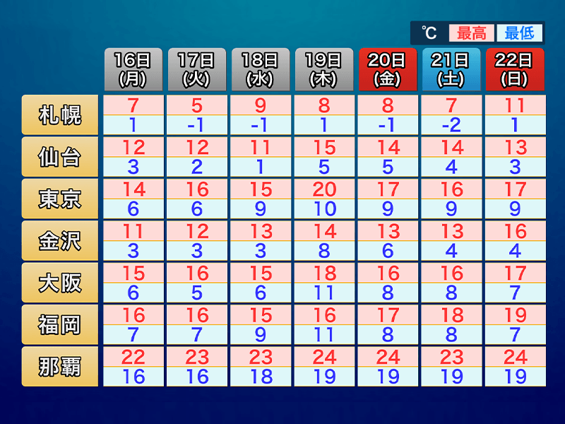 気温の高い状態は明日16日(月)以降も続く予想となっています。名古屋市ではこの週末になって平年を上回る気温となり、明日以降も最高気温は平年より高い17℃前後まで上がる見込みです。