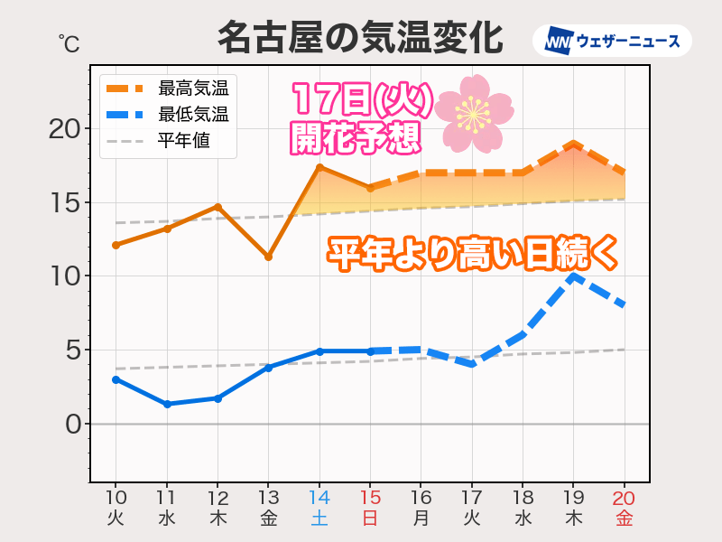 この暖かさで桜の蕾の生長がペースアップし、最新の予想では名古屋市は17日(火)にソメイヨシノが開花するとみられます。18日(水)〜19日(木)の雨が開花を促し、20日(金)からの三連休はさらに多くの花が咲きそうです。少し早めのお花見を楽しめるかもしれません。