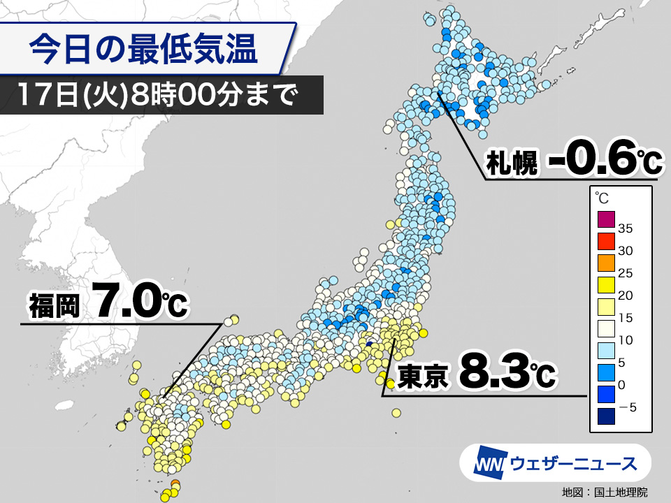 8時00分時点の最低気温は、福岡7.0℃、大阪6.3℃、名古屋5.3℃、東京8.3℃と、西日本や東日本の各地で5℃を上回り、朝の冷え込みは控えめです。