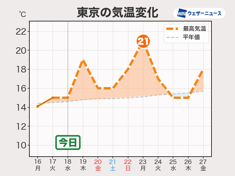 明日18日(水)以降も日本周辺は暖かな空気に覆われます。特に明後日19日(木)頃からは気温がさらに上昇。週明けにかけて関東でも20℃に達する4月上旬並みの陽気となる日がありそうです。