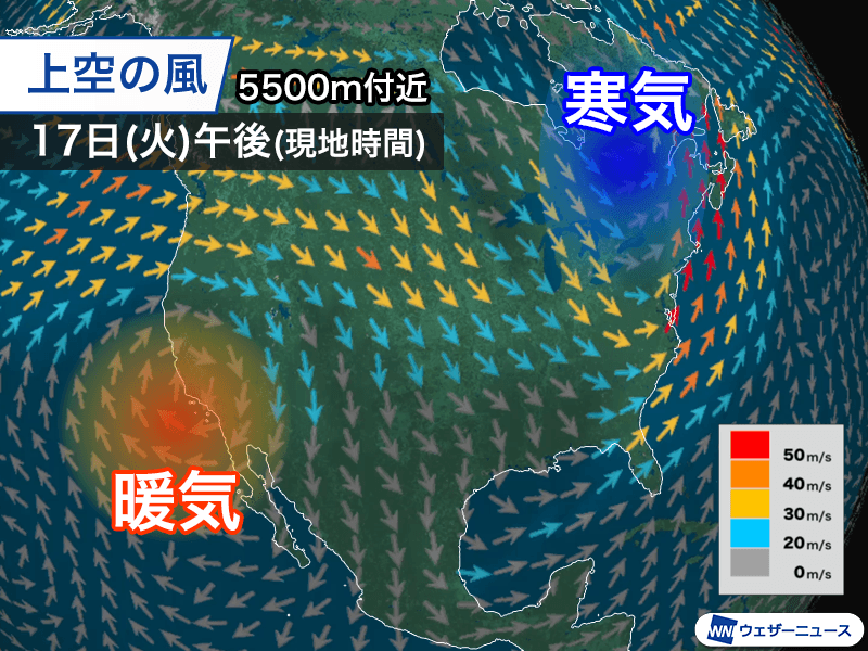 偏西風の状況を見ると、アメリカ付近で大きく蛇行していて、北から南に流れているアメリカの東部には冬の寒気、南から北に流れている西部には夏の暖気が流れ込みやすくなっています。
