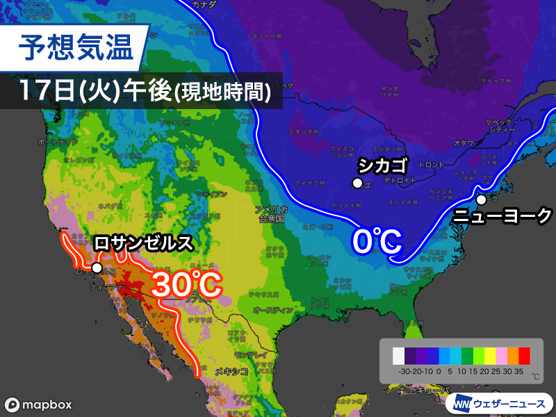 反対に西海岸は気温が高く、カリフォルニア州南部からアリゾナ州にかけては30℃以上のエリアが広がり、メキシコとの国境近くでは35℃以上となる見込みです。ロサンゼルスでも35℃前後に達するとみられます。