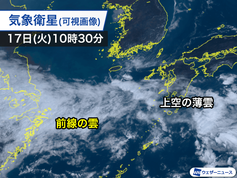 衛星画像では大陸から東シナ海に雲の帯が伸びていて、その先端にあたる上空の薄雲が九州にかかっている様子が確認できます。
