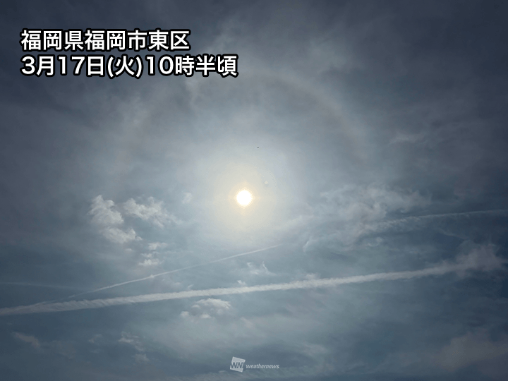 今日の九州は日差しは届いているものの、上空の高い所に雲が広がってきています。福岡県内では太陽の周りに光のリング「ハロ」がみられました。