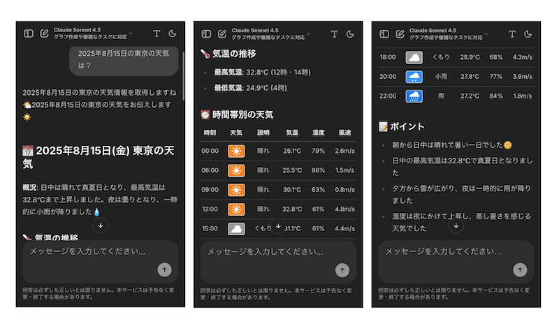 使い方はシンプルで、「2025年8月15日の東京の天気は?」といったように、自然な言葉で質問するだけ。気温や降水量などの詳細な気象情報をすぐに確認できます。