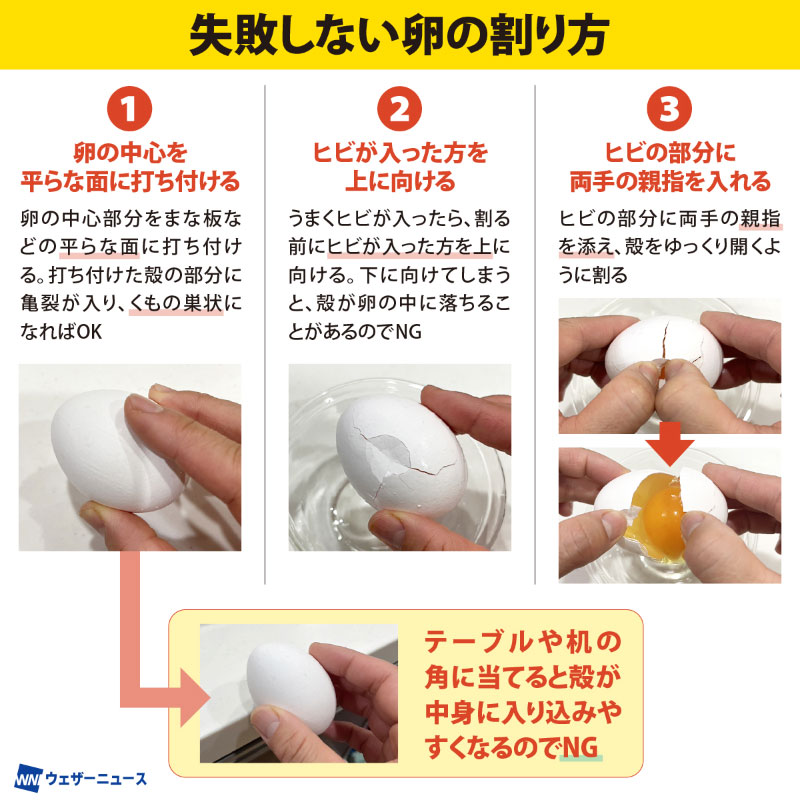 「よくある失敗として、卵の殻が入ってしまうケースがあります。そういう人は、卵を割るとき、テーブルや机の角に当てていませんか?