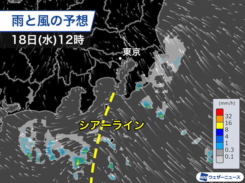 関東は低気圧や前線の接近前から、シアーライン(風の流れが変化する境界線)周辺の雲が広がり、沿岸部では一時的に雨の降る所があります。