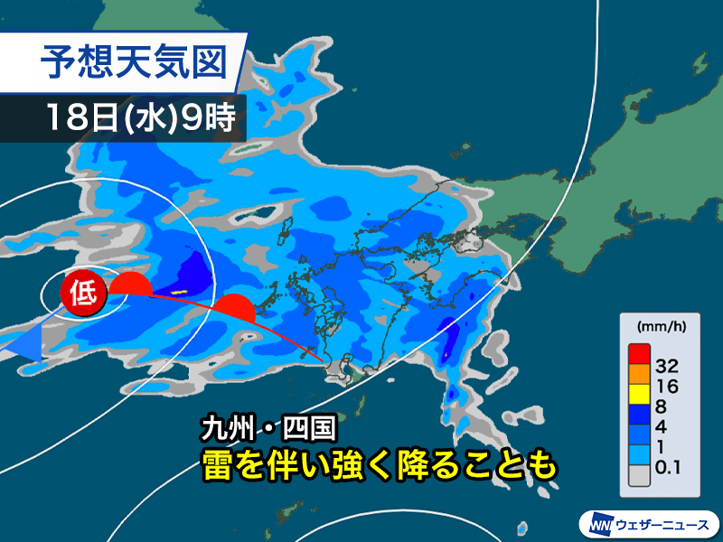 夜遅くには西から前線の雨雲が広がり、19日(木)の朝にかけて各地で本降りの雨になります。日中も雲が残り、すっきりしない天気が続く見込みです。