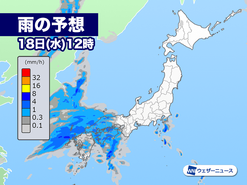 九州では朝から雨が降り始め、中国地方や四国でも次第に雨雲が広がってくる見込みです。太平洋側を中心に局地的に強い雨や雷雨となるおそれがあるため注意が必要です。