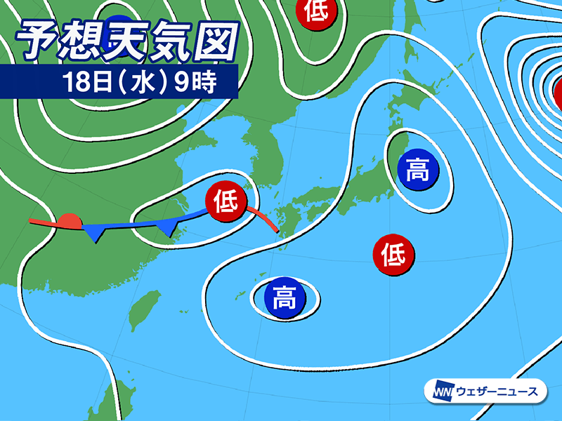 明日18日(水)は前線を伴った低気圧が西から接近し、西日本では雨が降り始めます。関東も雲が多く、所々でにわか雨がありそうです。北日本は午前中を中心に晴れ間が期待できます。