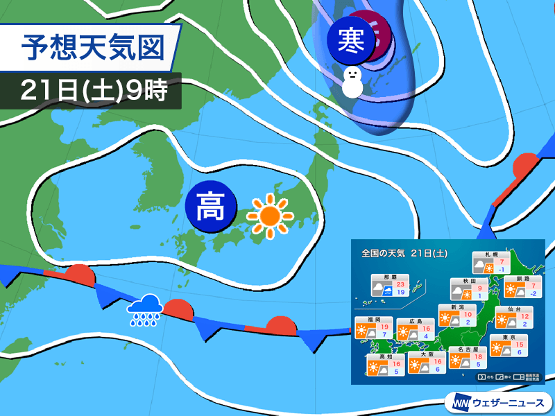 21日(土)は高気圧が中国地方に中心を移し、西日本から東北の広い範囲を覆う予想となっています。