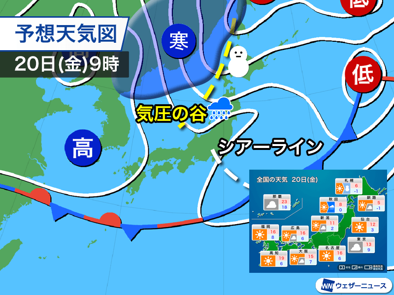 関東はシアーライン(風の流れが変化する境界線)の影響で雲が広がりやすく、にわか雨の可能性があります。また、北日本は寒気を伴った気圧の谷の接近に伴って雪や雨が降る見込みです。天気が崩れる分、気温は上がりにくくなります。