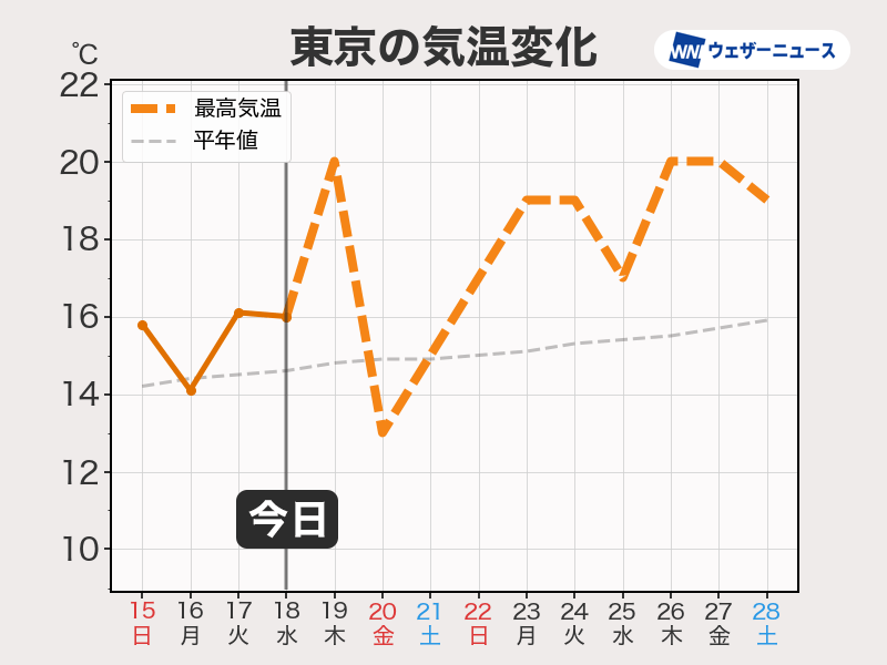 今週は気温が平年並みかやや高めの日が続きます。東京でも日中は20℃近くに達する日がある予想です。北海道も10℃近くまで気温が上がる日が増えます。