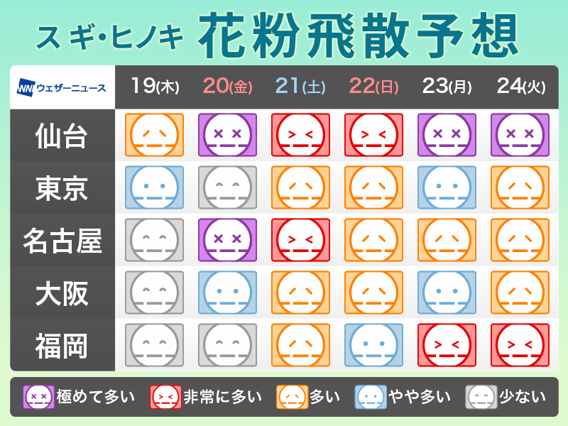 ただ、花粉の飛散はピークを迎えていて、西日本や東日本ではだんだんとスギ花粉からヒノキ花粉へと移行しはじめています。症状の出やすい方は、引き続きの万全の対策が欠かせません。