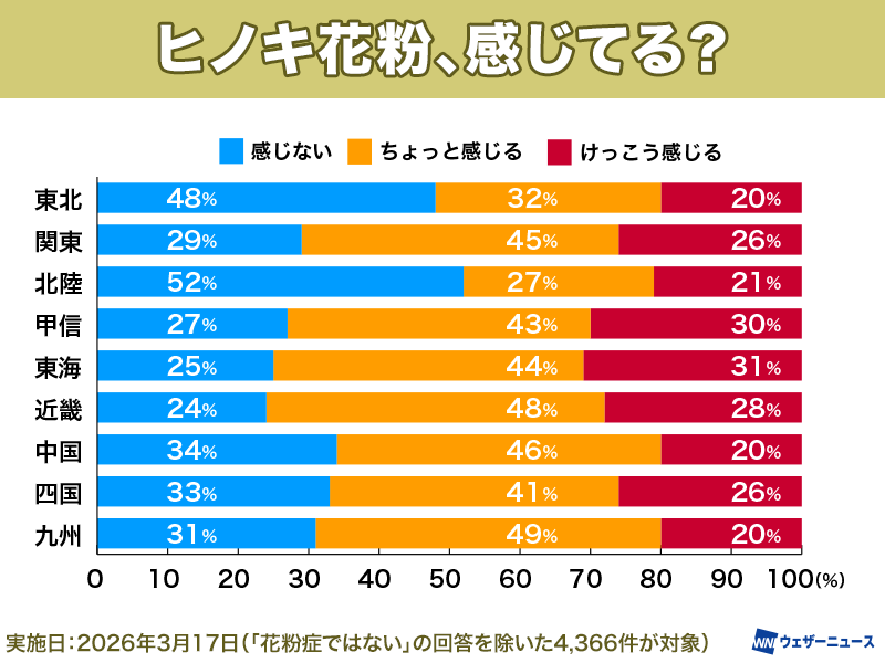 また、東北はヒノキ花粉の本格的な飛散は南部を中心に4月上旬〜中旬ごろが目安で、3月中旬はまだ飛び始めの段階なので感じている割合が低いと考えられます。