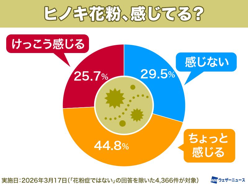 3月17日(火)に実施した調査では、ヒノキ花粉を感じる(ちょっと感じる+けっこう感じるの合計)と回答した方は全体の70.5%でした。