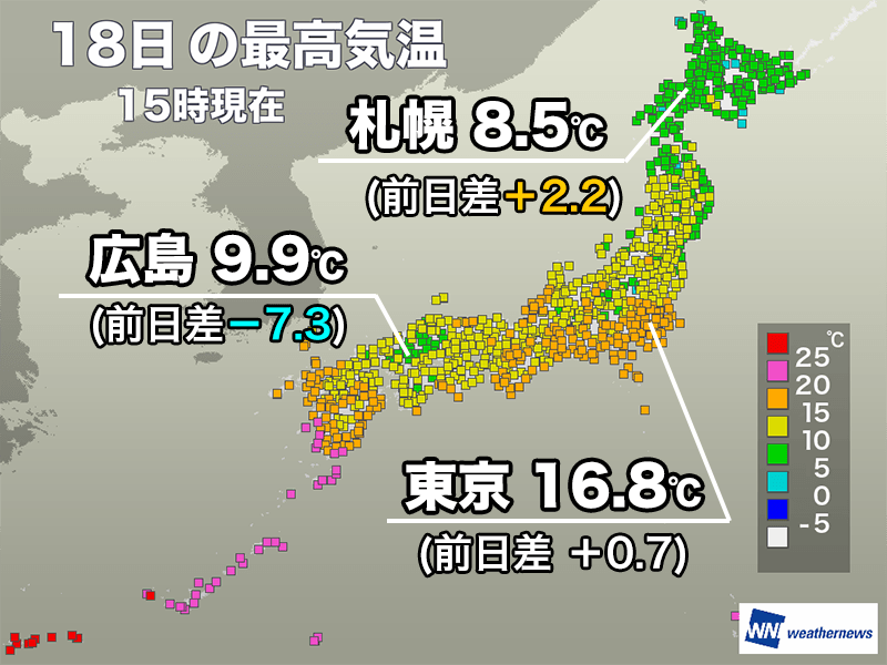 朝から雲に覆われ、雨も降り出した九州や中国、四国は昨日までに比べて気温が低くなっています。15℃に届かなかった所が多く、一部では一桁となりました。15時までの最高気温は広島市で昨日よりも7.3℃低い9.9℃、松山市は12.1℃に留まっています。
