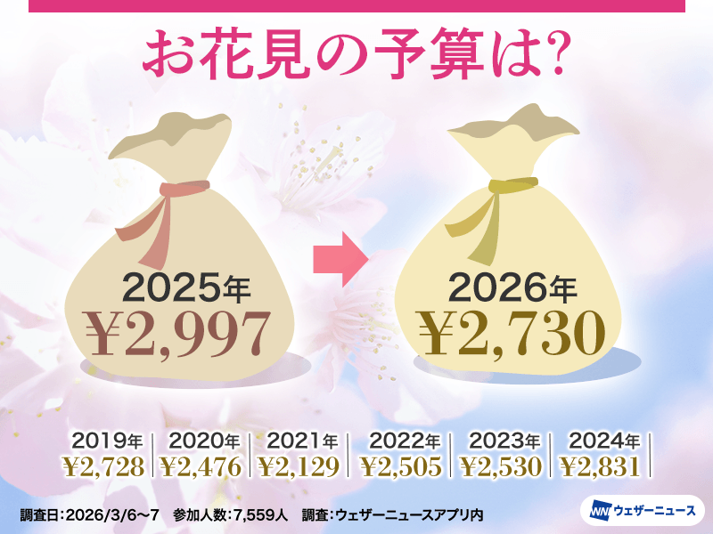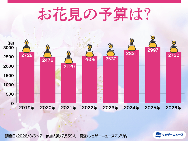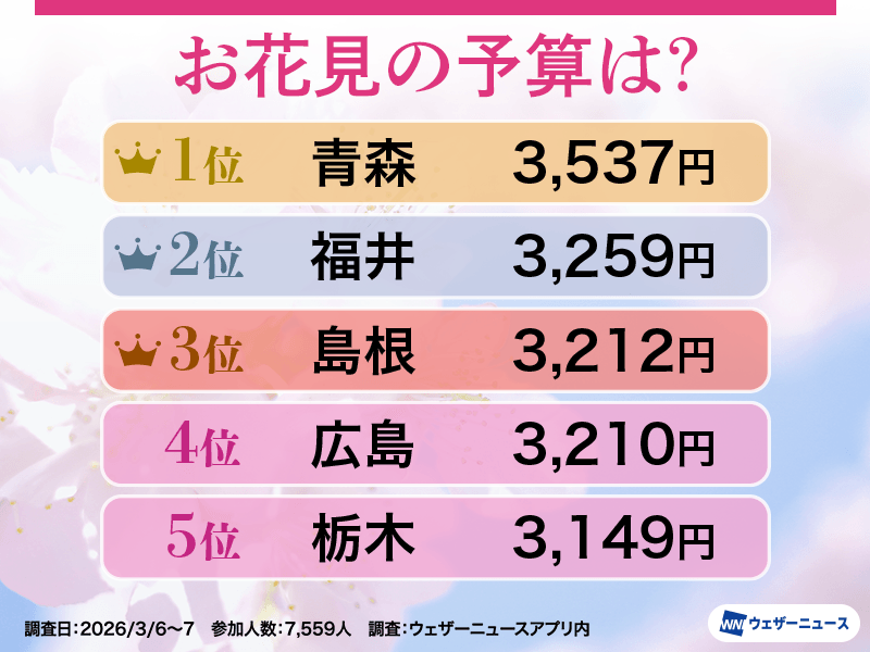 昨年の調査結果「桜お花見調査 予算は過去7年で最高額 石川や富山は500円前後が多数派」