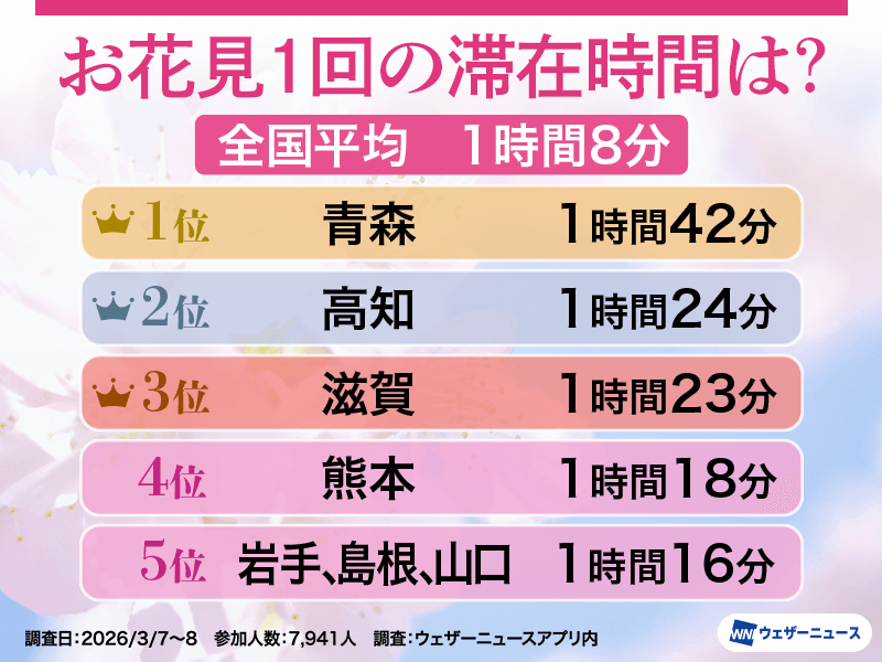 「お花見1回の滞在時間」を伺ったところ、予算額に続きこちらも青森県がトップで、1時間42分という結果が出ました。