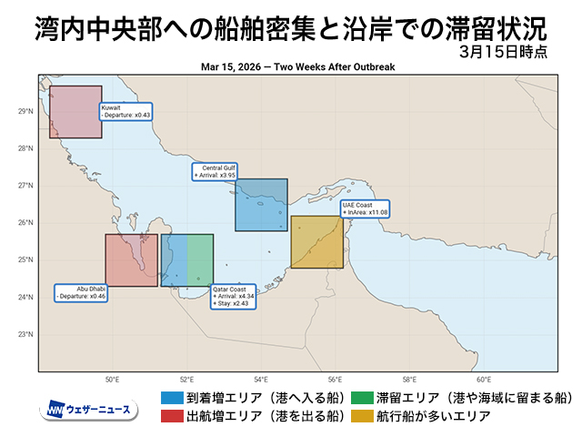 ウェザーニューズは、ペルシャ湾全域の船舶の動向を位置情報が取得できるAIS(船舶自動識別装置)のデータから分析を行っています。3月15日時点でUAE(アラブ首長国連邦)付近を航行している船舶数は、通常の11倍にまで膨れ上がっています。カタール沿岸域も同様の傾向です。
