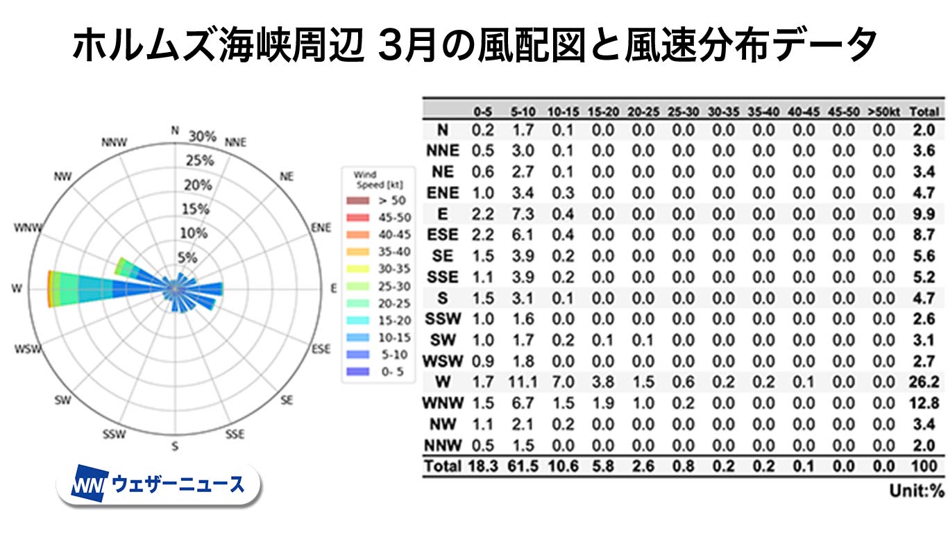 ホルムズ海峡周辺 3月の風配図と風速分布