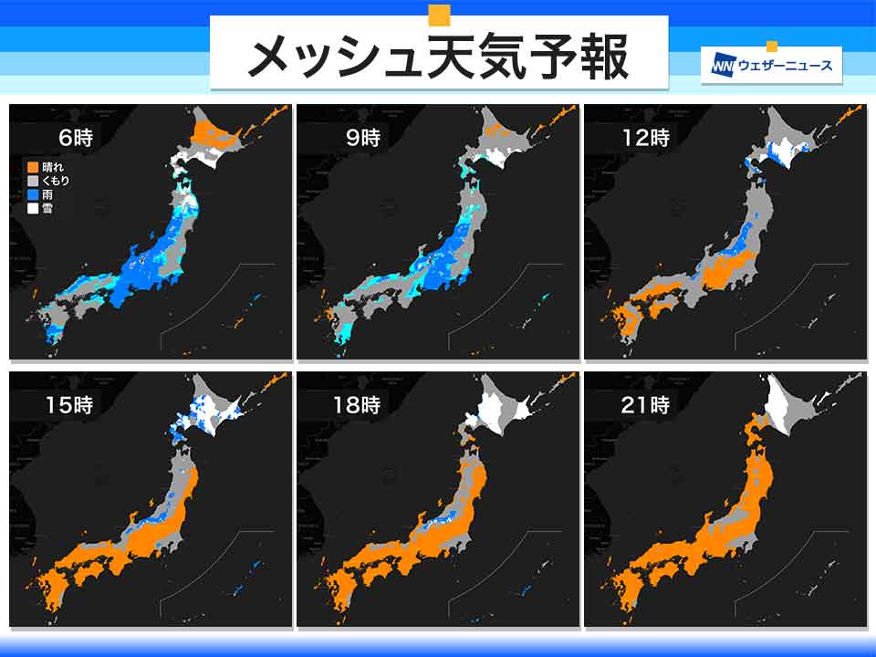 今朝雨を降らせている雨雲は午前中のうちに弱まる見込みで、昼までに雨のピークを越えるところがほとんどです。