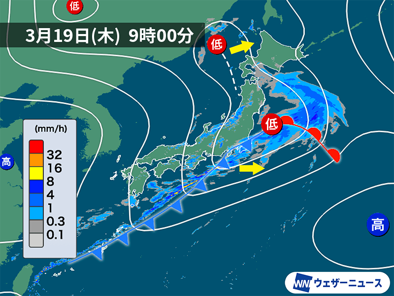 前線を伴った低気圧が、昨日18日(水)に西日本に接近し、今朝までに関東付近を通過しました。この低気圧や前線の影響で九州〜東北地方の広範囲で今朝は雨が降っています。