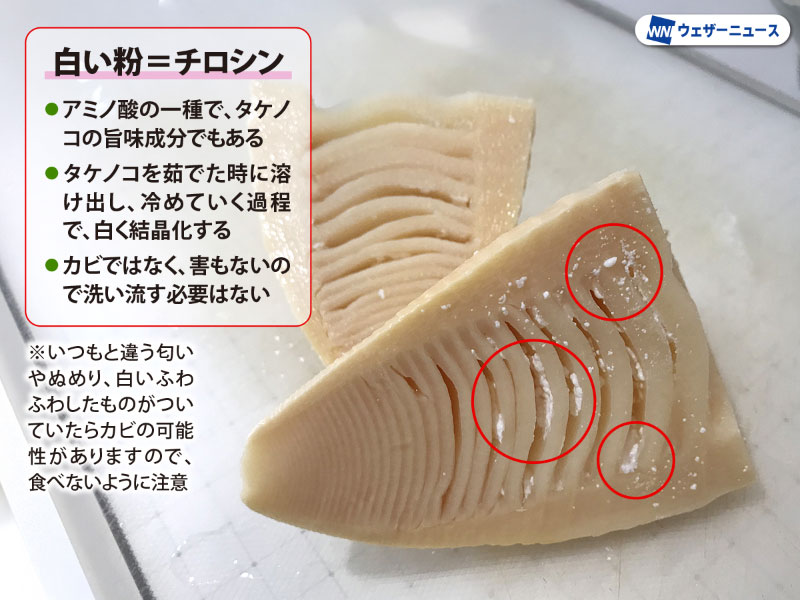 チロシンはタケノコの旨味成分でもあります。また、積極的に摂取すると、脳を活性化し、ストレス緩和、集中力を高める作用があると言われています。もちろん、カビではなく害もないので洗い流す必要はありません。