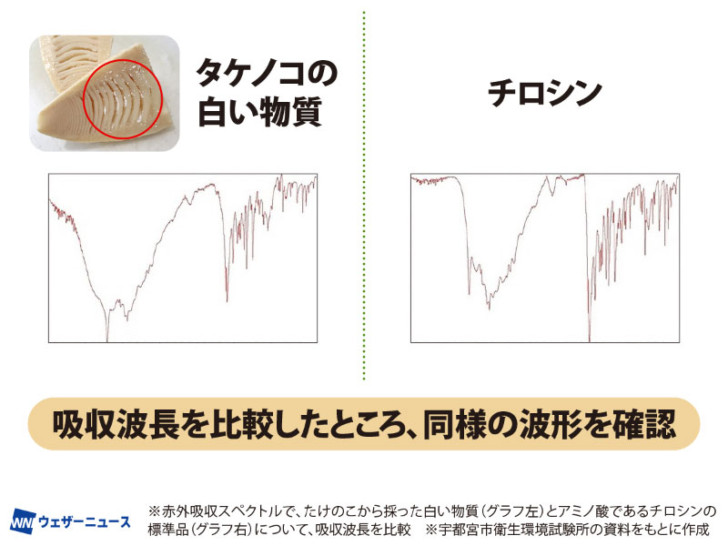 白い粉の正体について、宇都宮市衛生環境試験所がこの粉とアミノ酸の一種チロシンを赤外吸収スペクトルで分析したところ同様の波形をしており、結果、タケノコの白い粉の正体はタケノコに含まれるチロシンであるとしています。