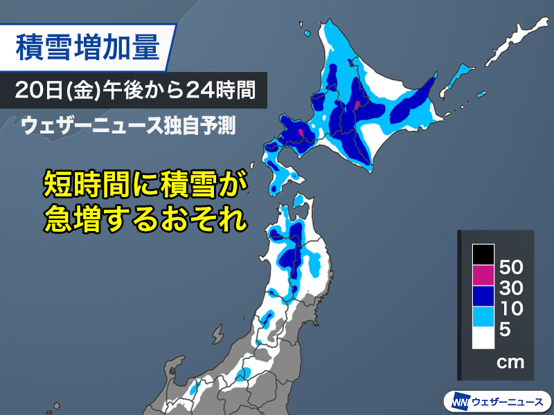 寒気が強いため大気の状態が不安定になり、市街地でも短時間に雪が強まって、積雪が急増してもおかしくありません。