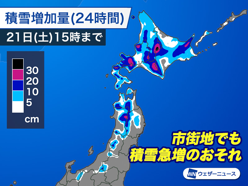 寒気が強いため大気の状態が不安定になり、北海道や東北北部の市街地でも短時間に雪が強まって、積雪が急増してもおかしくありません。