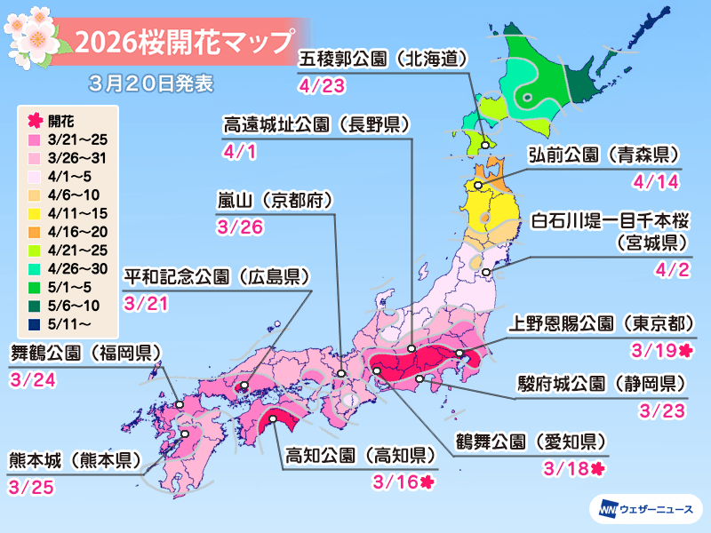 今週16日(月)に岐阜と高知でスタートした全国の桜の開花。来週までには関東以西の広い範囲で開花し、4月に入るとともに東北南部で咲き始める予想となっています
