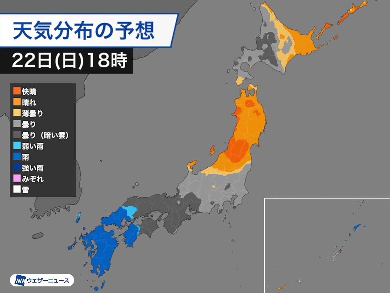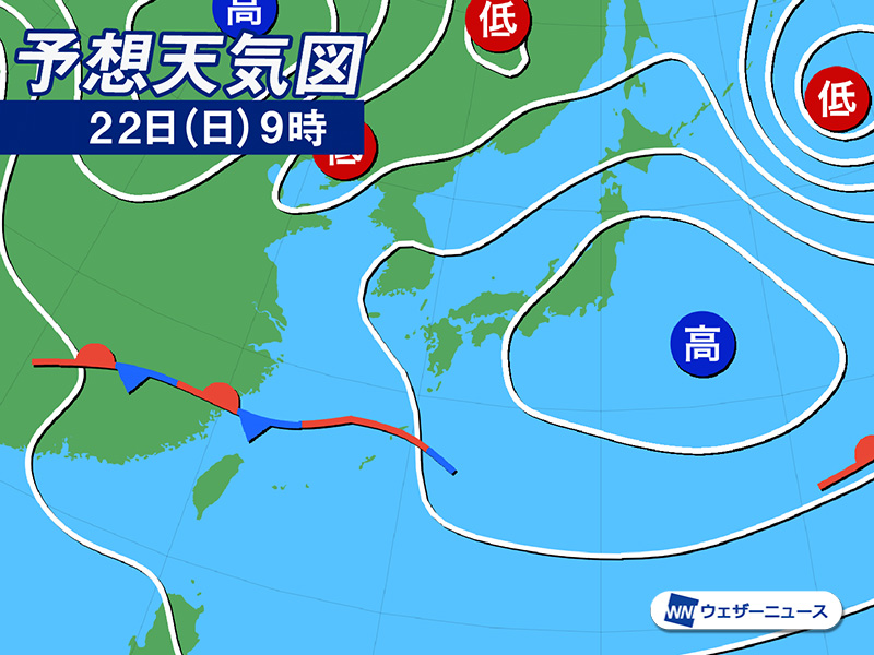 連休最終日の明後日22日(日)は、西から前線が近づいてきます。天気は下り坂で、九州では昼頃から雨が降り出す見込みです。日曜日のお出かけは雨具をお持ちください。