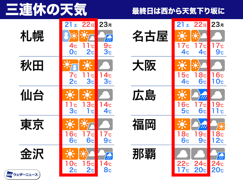 三連休中日の明日21日(土)は、西日本や東日本で青空が広がります。しかし、最終日の22日(日)は天気が下り坂です。九州は昼頃から雨になり、中国・四国も午後は段々と雨が降り出す見込みです。