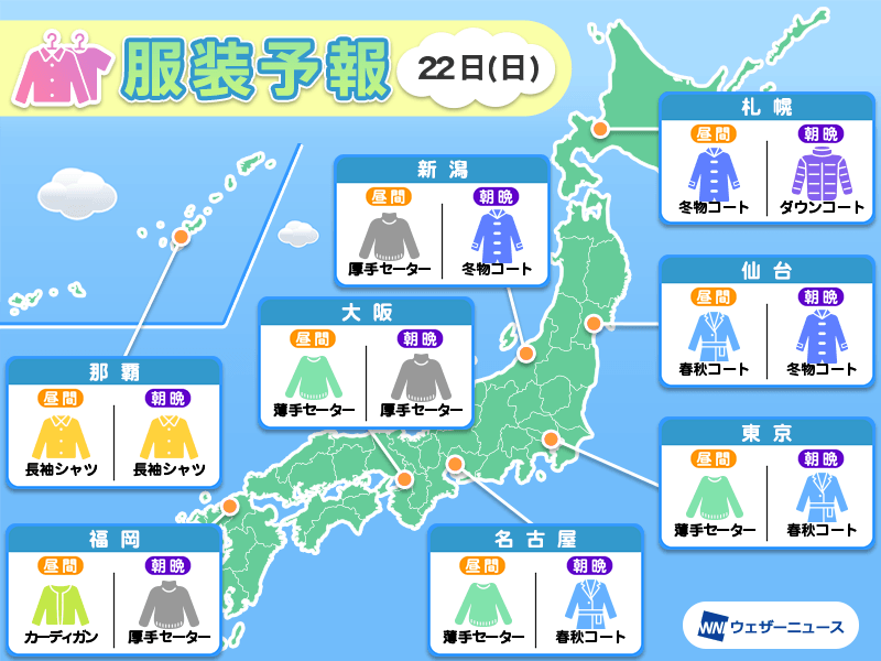 今日と明日の気温変化を比較して、気温に適した服装をご提案します。ウェザーニュースの服装予報もご活用ください。