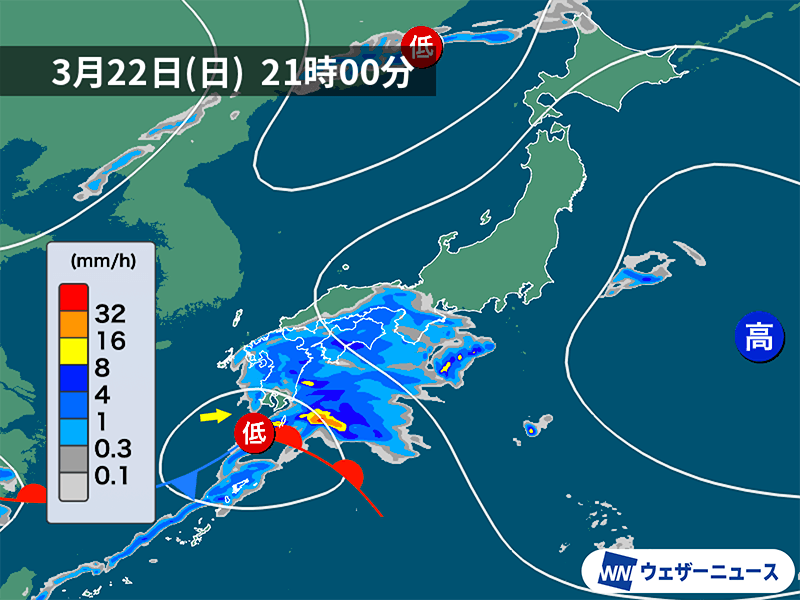 東シナ海の前線上に低気圧が発生し、今夜九州の南を通過します。この低気圧や前線の接近に伴い九州から雨の範囲が徐々に拡大し、午後には中国・四国地方でも雨が降りだします。出かけるときに雨が降っていなくても傘をお持ちください。夜には近畿でも雨の可能性があります。