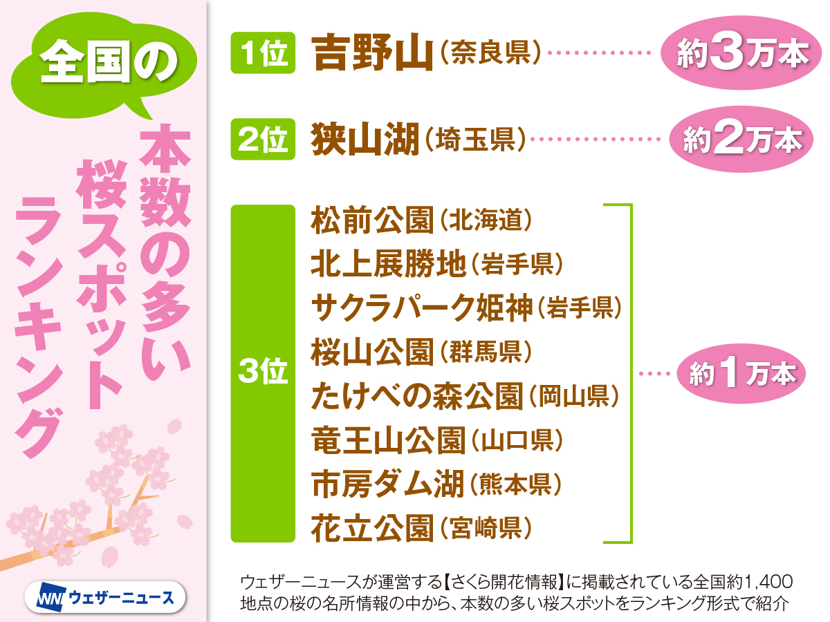 今回は、ウェザーニュースが運営する【さくら開花情報】に掲載されている全国約1400ヶ所の桜の名所情報の中から、桜の木の本数の多い順に名所をランキング形式でご紹介します。