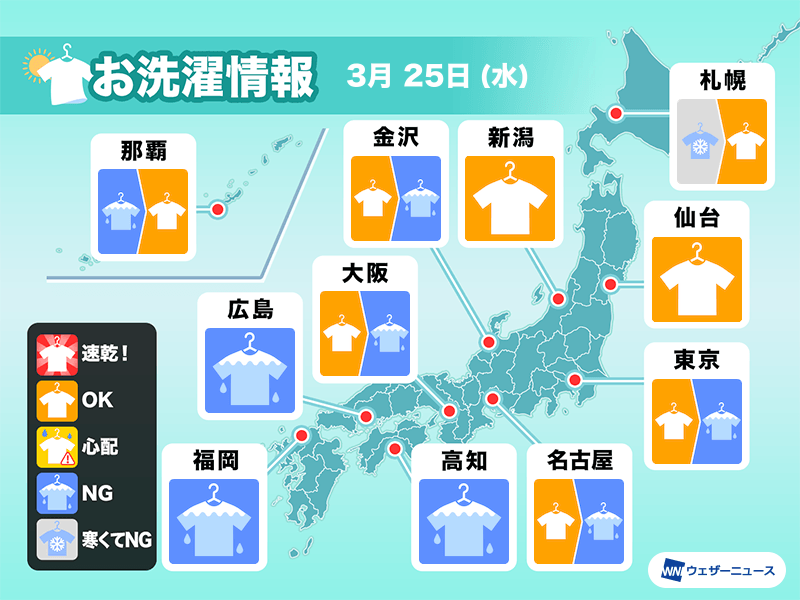 一方、北日本は晴れて日差しが暖かく、外干しした洗濯物はよく乾きそうです。ただ、スギ花粉の飛散が多いため、花粉症の方は払い落としてから取り込むか、部屋干しするなどした方が安心です。
