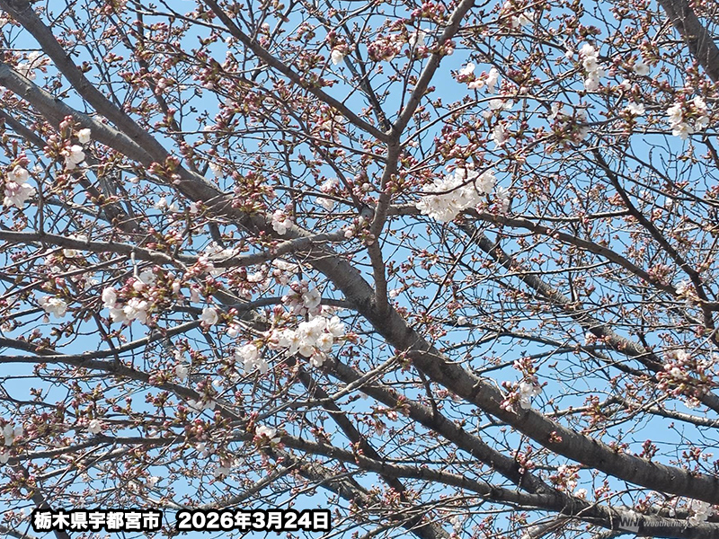 今日は、この暖かさで桜の開花も進んでいます。24日(火)12時までに、宇都宮、松山、宮崎のソメイヨシノが開花したと各気象台から発表がありました。さらに、今週は春らしい暖かさが続く見込みで、東京・上野恩賜公園では週末には満開を迎える見通しです。