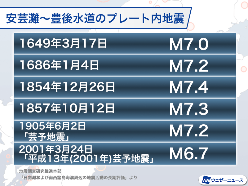 芸予地震の震源となった安芸灘~伊予灘~豊後水道では、沈み込んでいるフィリピン海プレート内部の地震が比較的短い周期で発生しています。17世紀以降だけで見ても、マグニチュード7クラスの地震が6回確認されています。