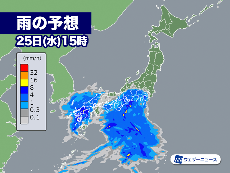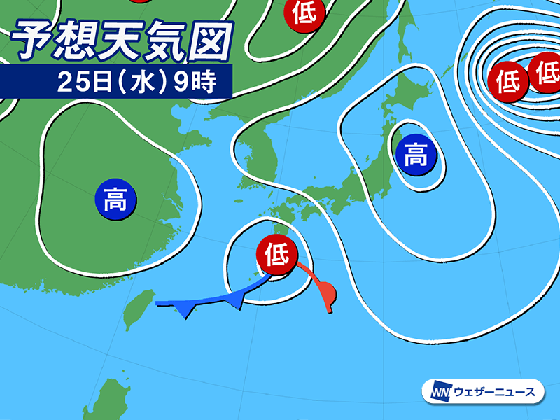 明日25日(火)は本州南岸を低気圧が通過。九州や中四国、沖縄では朝から雨が降り、傘が手放せない1日になります。