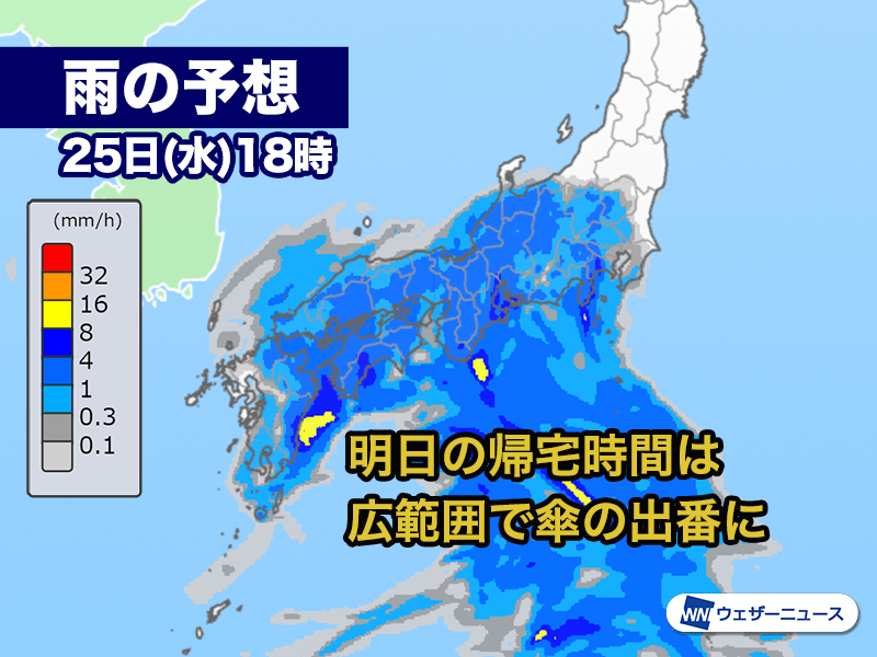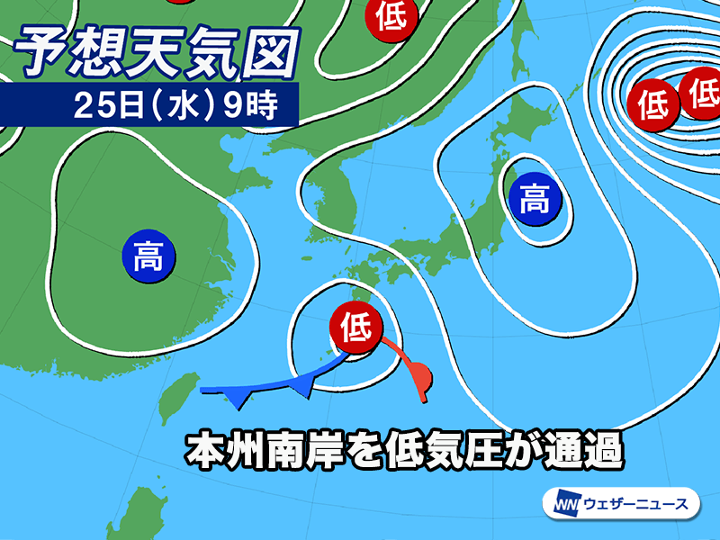今夜から明日25日(水)にかけて前線上に低気圧が発生し、本州の南岸を東に進む予想です。明朝は九州や中四国で広く雨が降り、傘が手放せない1日になります。