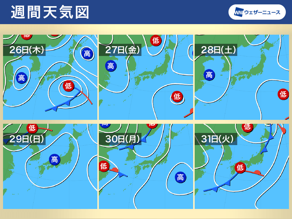 この一週間は短い周期で天気が崩れるため、こまめに天気予報を確認して、洗濯物の外干しや布団干しなどは計画的に行うようにしてください。