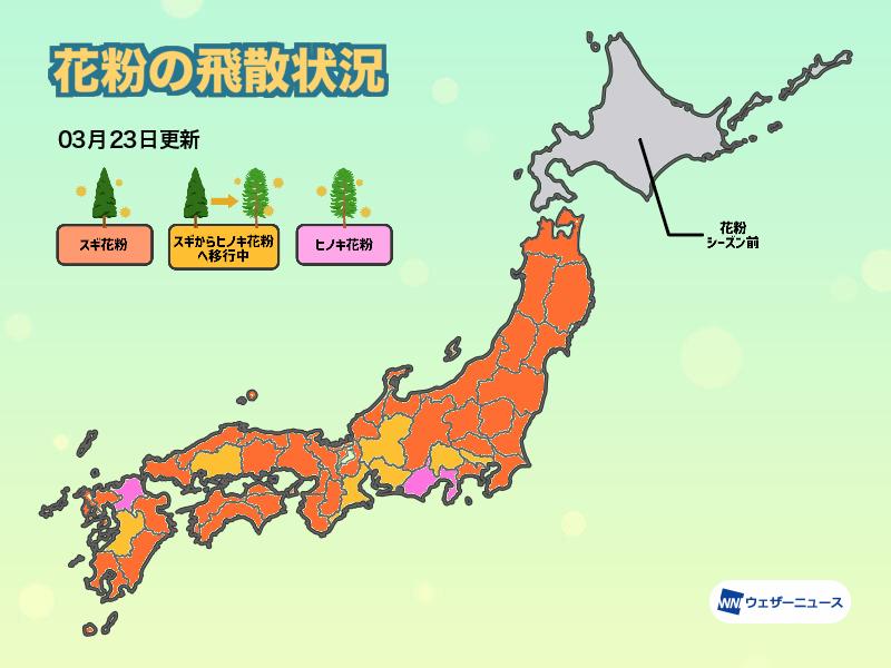 東北から北陸はスギ花粉のピークを迎えています。関東から西日本では徐々にスギ花粉のピークを超え、ヒノキ花粉が本格化している所もあります。特に雨が止んだ後は花粉の大量飛散にご注意ください。