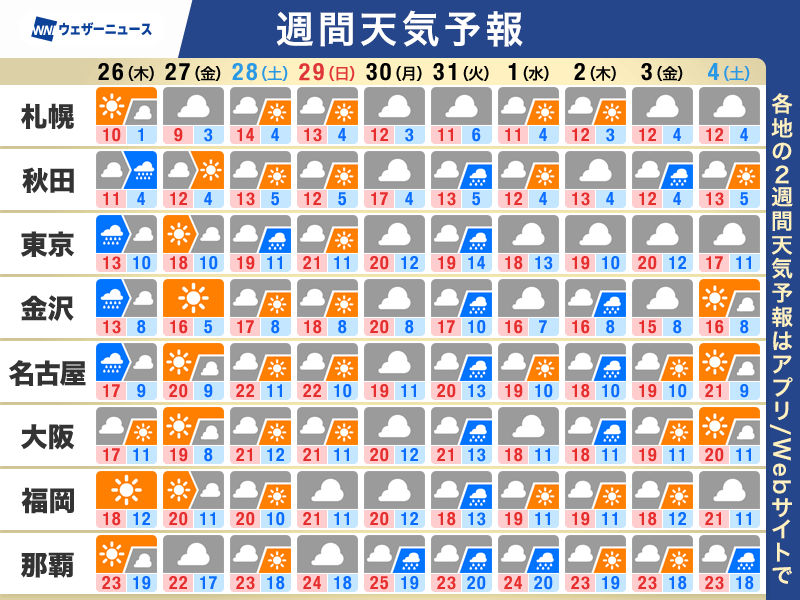 週末の28日(土)は上空の気圧の谷が接近し大気の状態が不安定になります。東日本は太平洋側を中心に雲が広がりやすく、山沿いほどにわか雨や雷雨の可能性があります。北日本も雲が広がりやすくなります。
