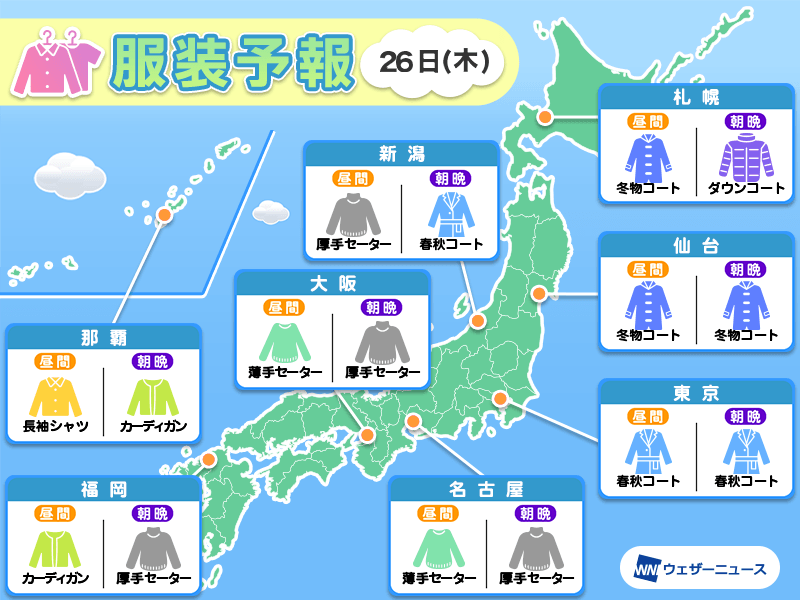 今日と明日の気温変化を比較して、気温に適した服装をご提案します。ウェザーニュースの服装予報もご活用ください。