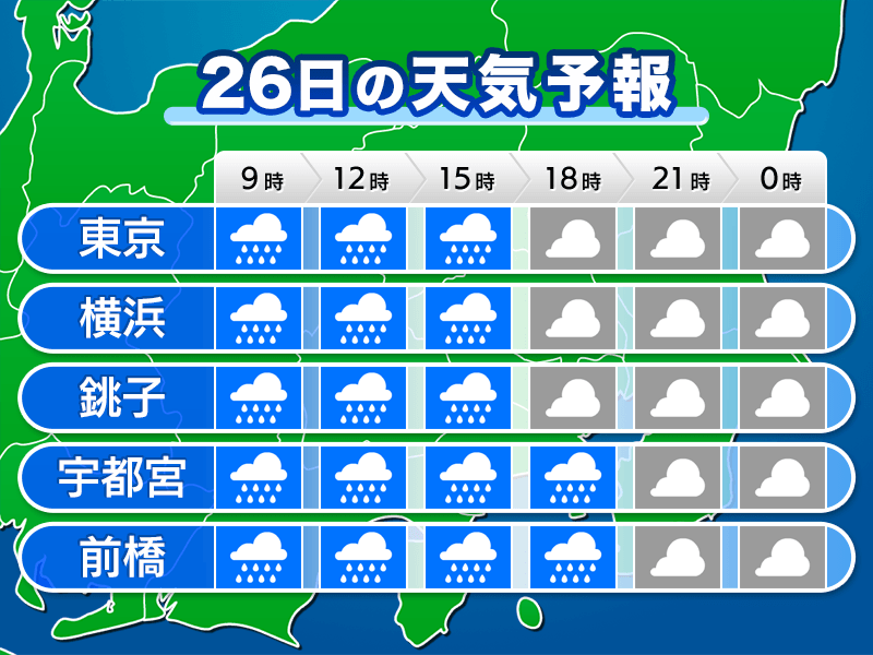 関東は低気圧の影響で、雨の降りやすい天気となります。昼頃までは広い範囲で雨が降り、夕方まで雨の残る所がある予想です。お出かけの際は傘が欠かせません。