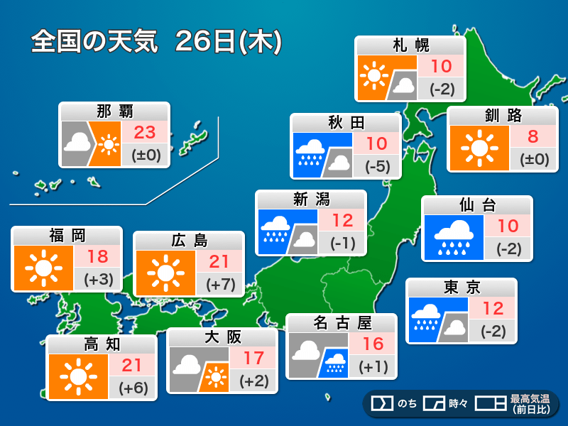 今日26日(木)は低気圧の影響で関東など東日本や東北で雨が降りやすくなります。一方、西日本では移動性高気圧に覆われて天気が回復し、晴れ間が戻る見込みです。
