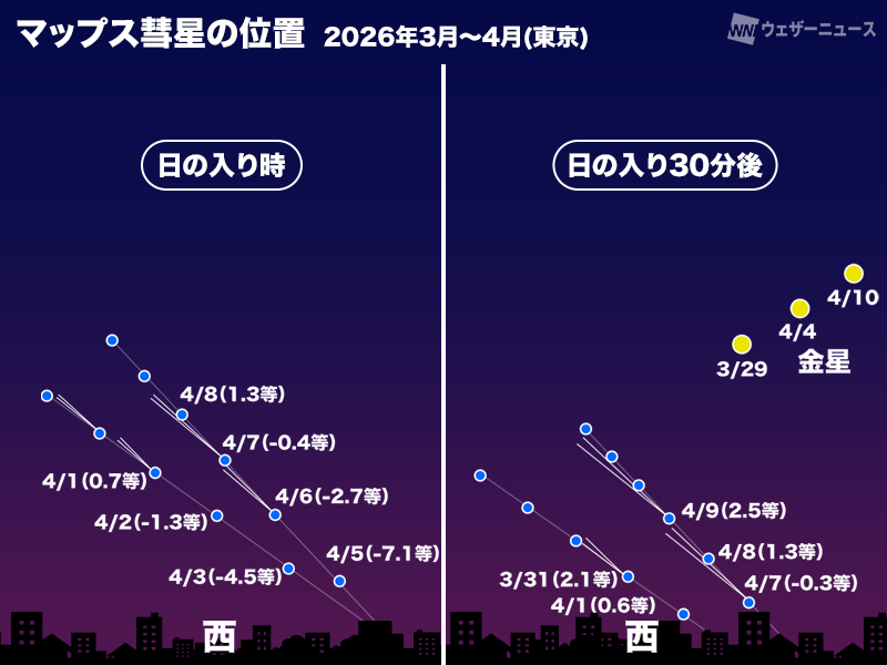 4月4日(土)には近日点を通過(太陽に最接近)する予定です。この時にマップス彗星は崩壊してしまう可能性が高いとみられていますが、もし残った場合には5日(日)の夕方から再び夕空に見える可能性があります。